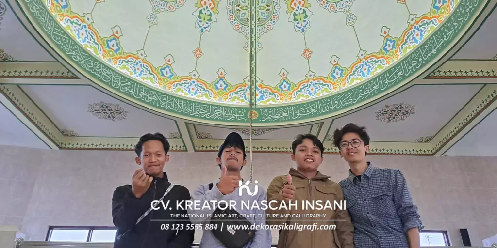 Kaligrafi yang terlukis pada kubah masjid di Jawa Tengah ini menggunakan gaya tradisional khat tsulus yang indah, dipadukan dengan motif floral-geometris khas Turki Utsmani (Ottoman). Warna dominan hijau, biru, oranye, dan putih memberi kesan cerah, bersih, dan artistik.